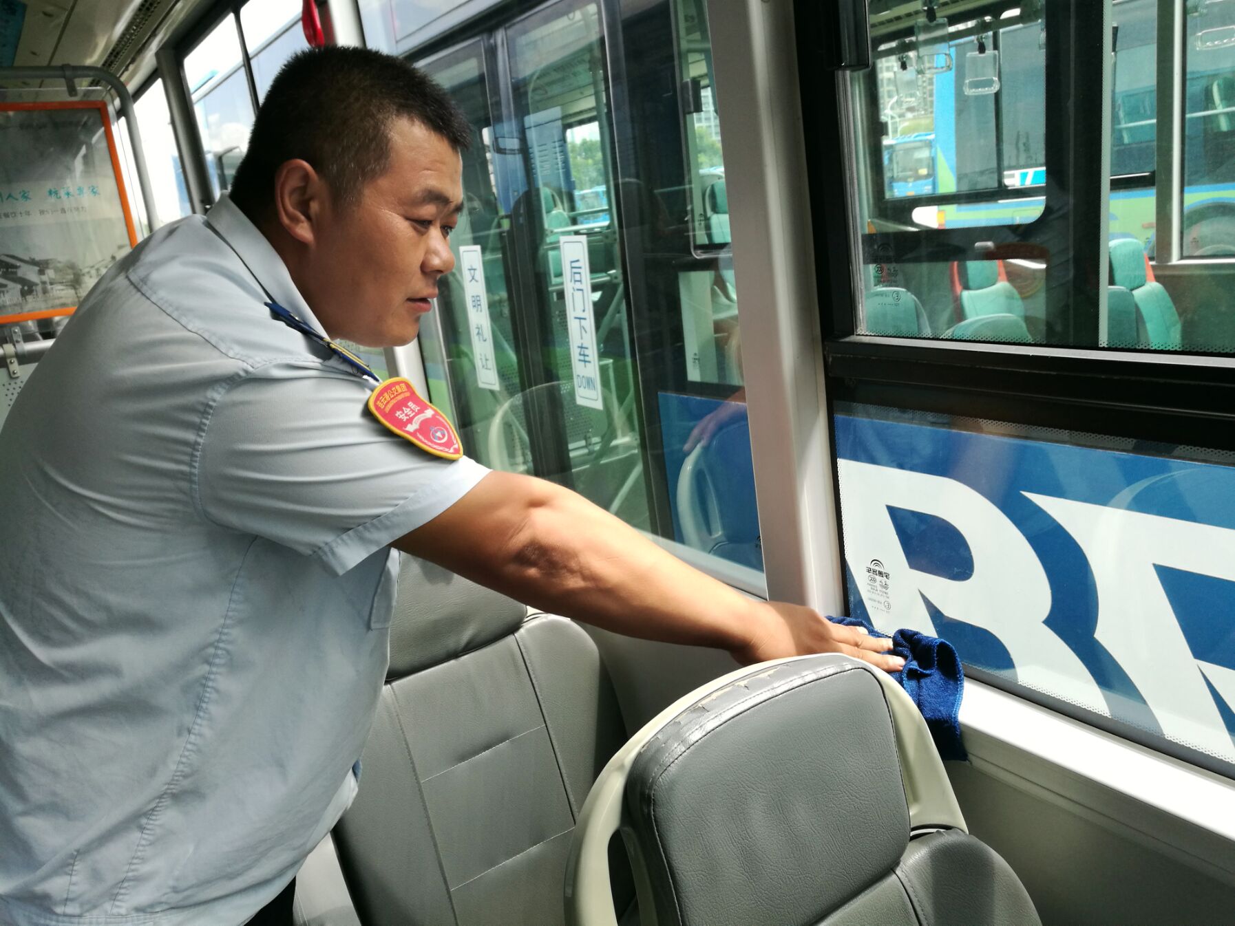 晚上收班后别人下班回家了,雷左德清洁工作又开始了,从车辆的地板到天花板,从拉手、扶杆到全车的车窗玻璃,甚至座位的靠背、座位垫,他都从头到尾的打扫干净。在雷左德的带领下,B12线上车辆卫生有了很大的提高。