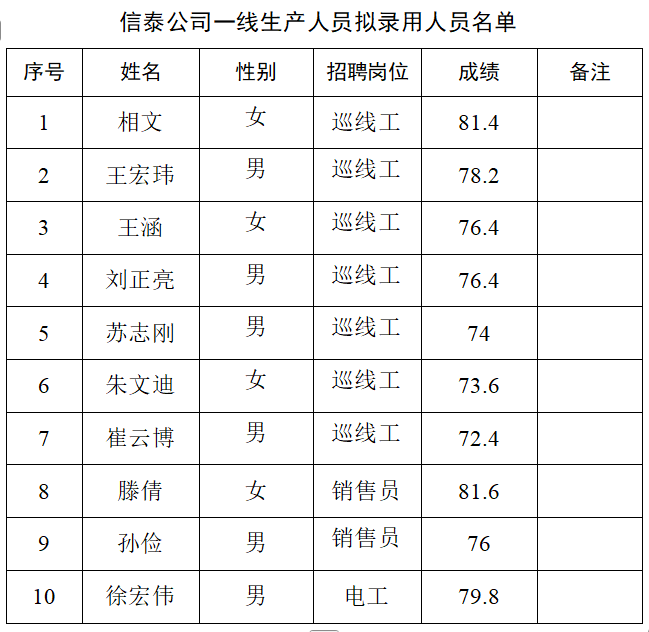 根据江苏信泰燃气有限公司招聘公告有关规定和要求,现将本次招聘拟录用人员名单予以公示。 公示时间:2025年3月21日至3月27日