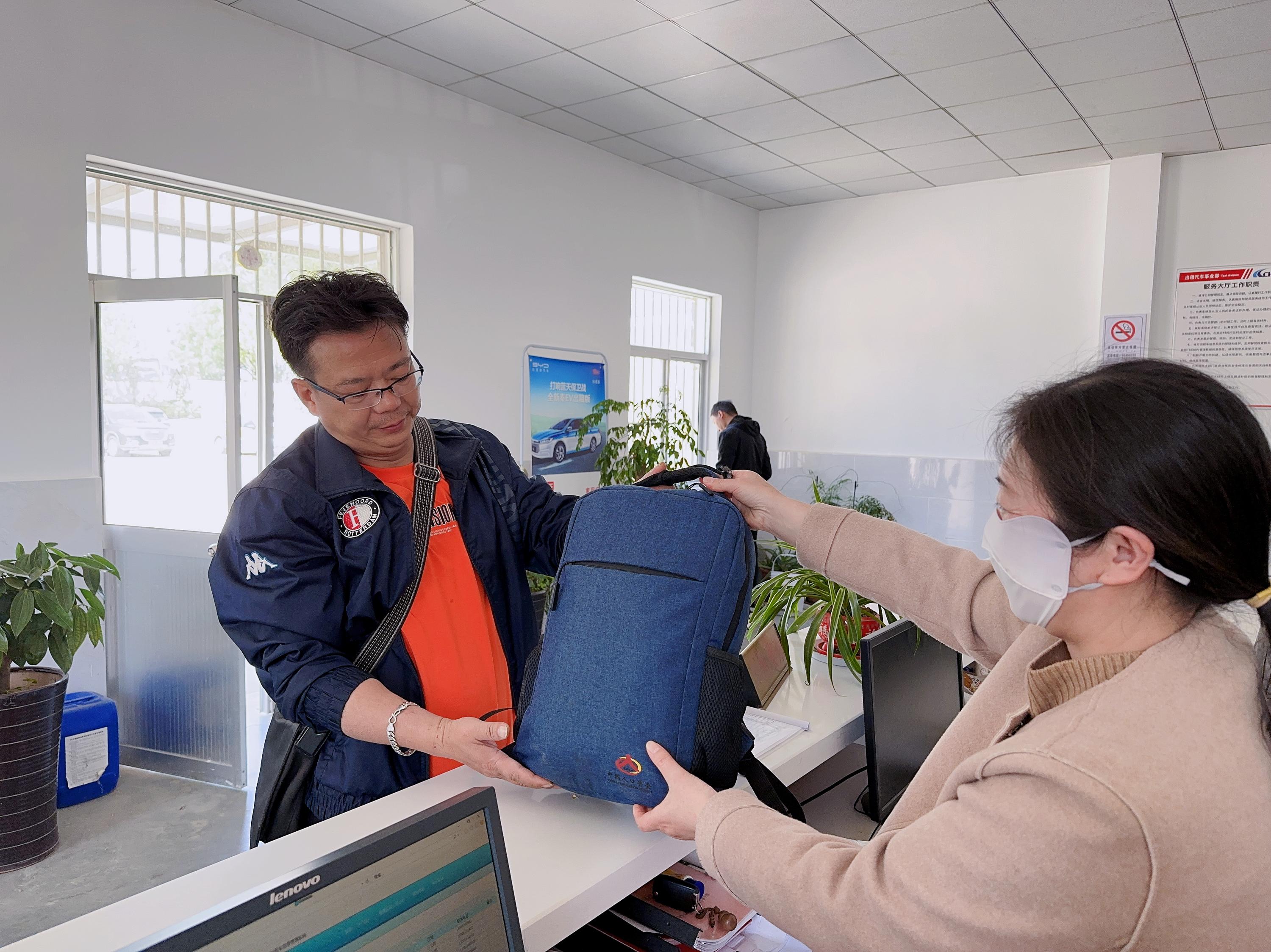 据了解,4月30日凌晨,来自云南的牛先生和家人在盐河巷吃饭,饭后打出租车回宾馆,牛先生坐在车子后排,因酒喝得稍多些,下车时不慎将背包落在了出租车后排下。因为酒精的作用回到宾馆后牛先生和家人就直接休息并未发现自己的背包丢失。当第二天早上要出门游玩才发现背包丢了,牛先生只隐约记得车身颜色和驾驶员收款的二维码姓名,当牛先生来到出租汽车事业部服务中心告知情况后,工作人员很快就通过牛先生提供的名字联系上当时开车的驾驶员赵师傅,并以最快的速度把背包交到牛先生的手中。