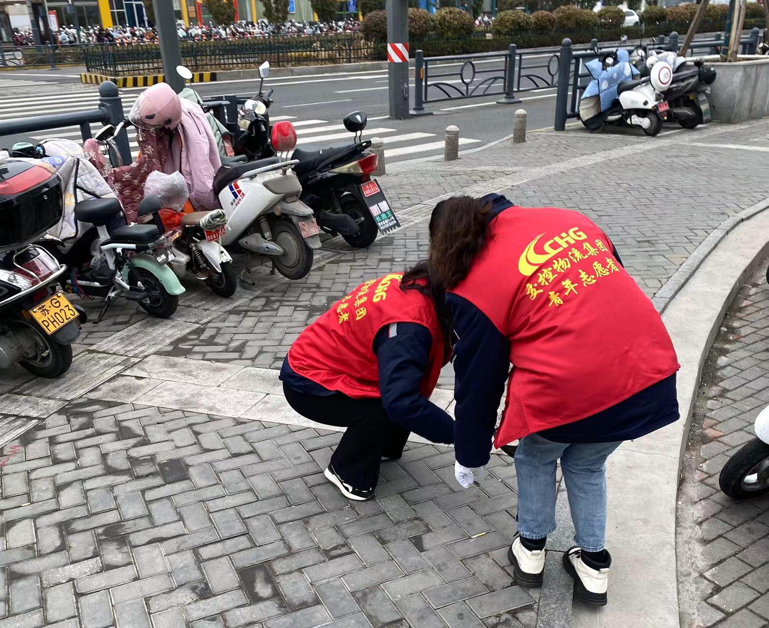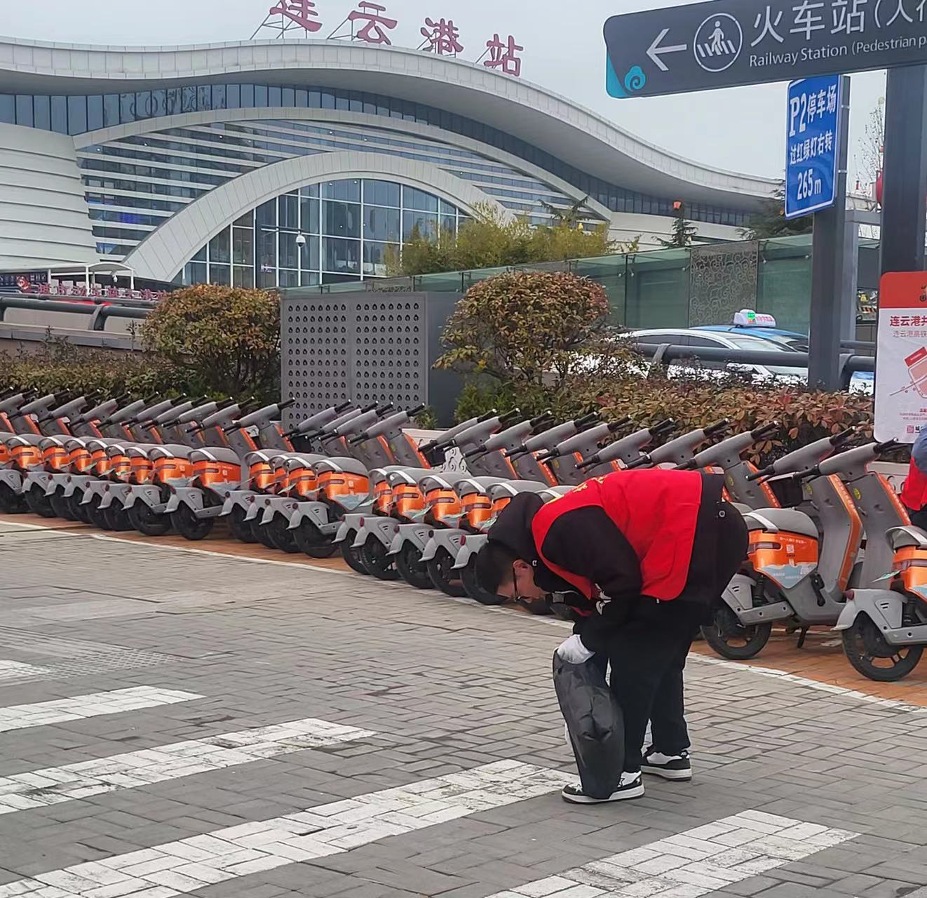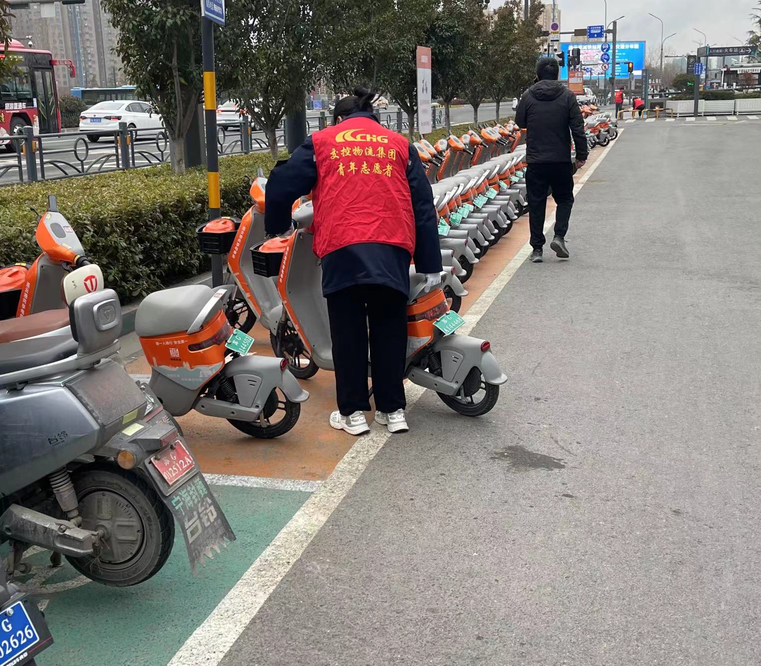 志愿者们身着红色马甲,带着手套、垃圾袋等工具,仔细清除高铁站附近人行道上暴露的烟头、白色污染等垃圾,一路走过去,确保不留死角;将乱停乱放的共享单车进行集中整理,移至划线的定点停放区域,按统一方向摆放整齐,避免共享单车堵塞道路、阻碍公众通行等问题的发生。