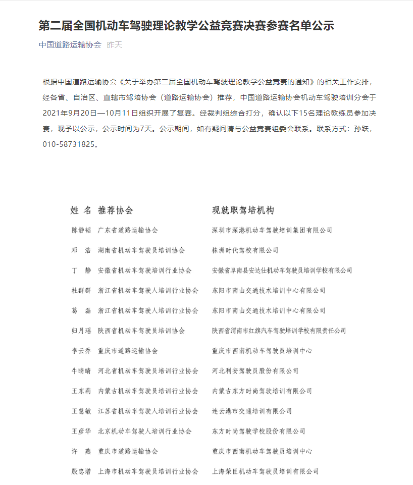 2021年8月,由交通运输部运输服务司、公安部交通管理局指导,中国道路运输协会主办,公安部道路交通安全研究中心、中国道路交通安全协会共同联办,中国道路运输协会机动车驾驶培训分会承办的第二届全国机动车驾驶理论教学公益竞赛正式启动,经过3个月的初赛、复赛,最终15名来自全国各省市理论教员进入11月2日在湖南长沙举办的总决赛。交培公司王慧敏同志通过层层比赛,最终进入全国总决赛,同时她也是江苏省仅此一人入围。